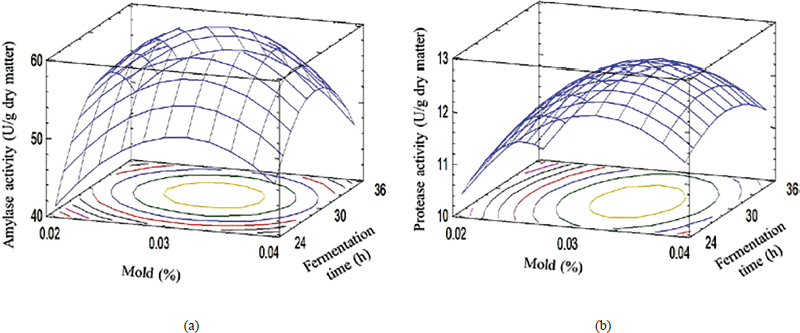 ![]() | Figure 4: The response surface and contour plots showing the effect of mold addition and koji-making time on (a) Amylase activity and (b) Protease activity. [Click here to view] |