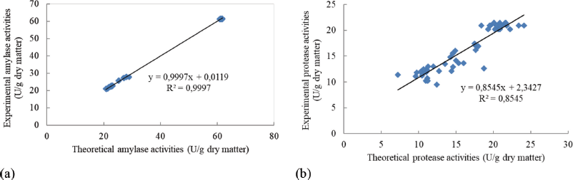 ![]() | Figure 8: Correlation between experimental and theoretical data (from Y3 and Y4) for (a) amylase activity and (b) protease activity. [Click here to view] |