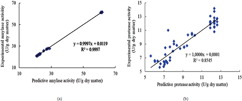 Regression equations showing the relationship of the molds addition and koji-making time to amylase and protease activities were described in Table 3. All equations met the conditions with a high coefficient of determination (R2 > 0.84). The compatibility between the predictive and experimental data of amylase and protease activities was shown in Figure 5 and there was a high correlation between predictive and experimental data (R2 > 0.84).