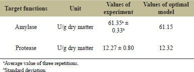 The results of simultaneous optimization of multiple response surfaces showed optimal amylase and protease activities when 0.03% of mold and 30 hours for incubation time were applied (Fig. 6). Amylase and protease activities were 61.62 and 12.52 U/g dry matter, respectively.