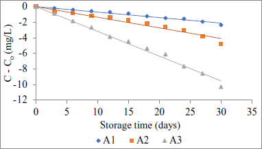 ![]() | Figure 8: Degradation of anthocyanin content in extracts during storage. A1: sample was stored at −9°C; A2: sample was stored at 4°C; A3: sample was stored at 28°C. [Click here to view] |