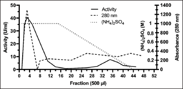 ![]() | Figure 2: Hydrophobic-interaction chromatography of polygalacturonase from Oncideres albomarginata chamela. Active fractions separated by cation exchange chromatography were applied to a column (8 × 20 mm) of HiTrap Phenyl FF equilibrated with sodium phosphate buffer (50 mM, pH 6.5) containing ammonium sulfate (1 M). A linear decreasing gradient of 1.0–0.0 M ammonium sulfate in the same buffer was used for sample elution, collecting 0.5 ml fractions. The fractions with the greatest activity on PGA (1–12) were poled for the next step. [Click here to view] |
