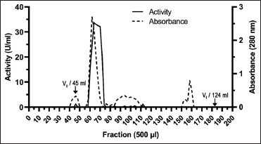 ![]() | Figure 3: Gel filtration chromatography of polygalacturonase from Oncideres albomarginata chamela. The enzyme fraction obtained from the hydrophobic-interaction step was applied on top of a column (60 cm × 26 mm) of Superdex 75 pg HiLoad 16/600 equilibrated and eluted with phosphate buffer (50 mM, pH 6) containing NaCl (150 mM). Elution of the sample was made with the same buffer, collecting fractions of 0.5 ml. Fractions 67–70 showing the maximum activity on PGA were pooled and labeled as the purified enzyme. [Click here to view] |