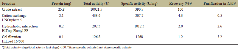 For purification, the crude extract was subjected to cation exchange chromatography [Figure 1], which allowed the removal of contaminants and unwanted proteins from the extract. The most active fractions on PGA (15–19) were subjected to a column of hydrophobic interactions, and in this case, the activity was detected in the fractions (1–12) that did not interact with the matrix [Figure 2]. This purification step improved the specific activity by 2.5 fold than that determined in the crude extract [Table 1] and allowed the removal of proteins with cellulase and xylanase activities (data not shown). Finally, the recovered proteins were separated by molecular exclusion on a Superdex 75 pg column. The activity analysis on PGA of the fractions indicates that the active fractions (67–70) correspond to a well-defined protein peak [Figure 3]. The purified polygalacturonase presented a specific activity of 1268 U/mg, which represents 3.2 fold of the specific activity determined in the crude extract and a recovery percentage of 1.2% [Table 1]. According to the analysis by SDS-PAGE, the purified polygalacturonase has a molecular mass of 37 kDa [Figure 4], and as shown in the zymogram, the enzyme is active on PGA.