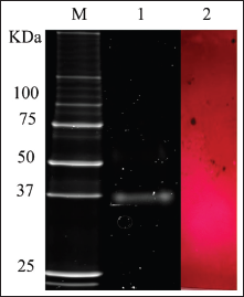 ![]() | Figure 4: SDS-PAGE of the polygalacturonase purified from the digestive tract (midgut) of the xylophagous beetle Oncideres albomarginata chamela stained with Oriole Fluorescent Gel Stain (Bio Rad). M, Precision Plus Protein Unstained Standard (Bio Rad); Lane 1, Purified polygalacturonase; Lane 2, Zymogram on acrylamide gel containing 1% PGA stained with ruthenium red [Click here to view] |