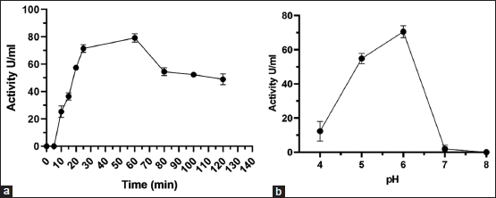 ![]() | Figure 5: Effect of pH and incubation time on PG activity. (a) Standard reactions were incubated for 37°C in 100 mM sodium phosphate buffer at pH 6.5 after the indicated incubation times (0-120 min). (b) Reaction mixtures were incubated at 37°C for 60 min at the indicated pH values with different buffers (sodium acetate for pH 4–5, phosphate for pH 6–7, and Tris for pH 8–9). All other components of the reaction mixture remained unchanged [Click here to view] |
