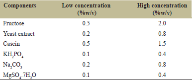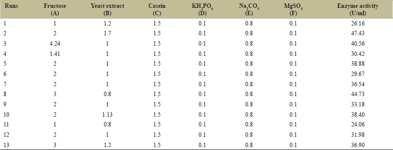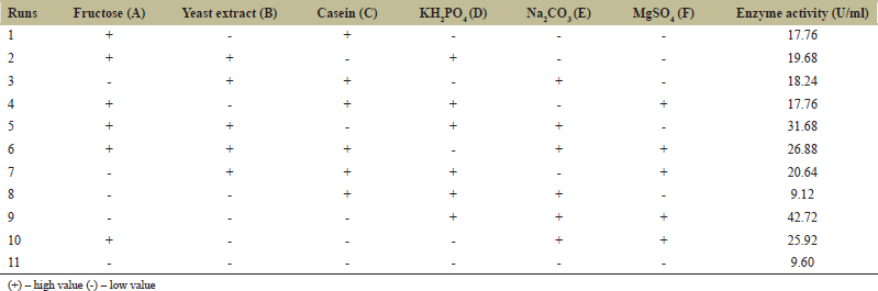 Screening of different variables affecting protease production was performed by PB design [23]. In this study, two levels of six independent variables (fructose, yeast extract, casein, KH2PO4, Na2CO3, and MgSO4 7H2O) were evaluated as shown in Table 1. These variables were selected for a twelve-run PB design, and the effect of the individual variable was determined by the following equation.