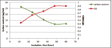 The carbon content was determined using a glucose standard graph. The estimation of carbon content was carried out using the DNS method where 1 ml of 3,5-dinitrosalicylic acid (DNS) was added to 1 ml of the crude enzyme and incubated for 10 min in a boiling water bath [22]. Subsequently, 8 ml of distilled water was added and the absorbance values were measured at 540 nm. Profiling studies were performed by comparing the production of protease enzyme to the change in carbon content and the change in biomass using suitable assays. A graph was plotted for protease activity versus carbon content to study the growth characteristics of the microorganism under study.