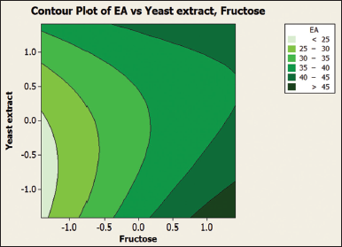 ![]() | Figure 8: 2D contour plots for studying the interaction of yeast extract and fructose for maximum enzyme activity (EA). [Click here to view] |