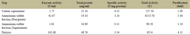 After 48 h of incubation, the cell-free supernatant was used for the partial purification (saturation level, 65% w/v) of the alkaline protease produced by B. cereus strain PW3A. The protein precipitate obtained was dissolved and dialyzed overnight against the phosphate buffer. Table 7 shows the results of enzyme purification by ammonium sulfate precipitation and dialysis. The partially purified enzyme is further used for characterization studies.
