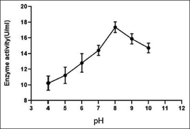 Figure 9 shows the effect of temperature on enzyme activity with a range from 20°C to 80°C. It is evident from the figure that at 50°C the enzyme activity was highest (18.7125 U/ml). Hence, the optimum temperature was recorded to be 50°C. However, it is also observed the enzyme retained significant activity between 40°C and 60°C indicating its thermal stability. The effect of pH on enzyme activity was studied at a pH range from 4 to 10. The highest enzyme activity was reported at pH 8, with an activity of 17.36 U/ml. The enzyme also showed stability with significant enzyme activity at a range of pH 8 to pH 10 indicating its alkaline nature with 8 being the optimum pH [Figure 10].