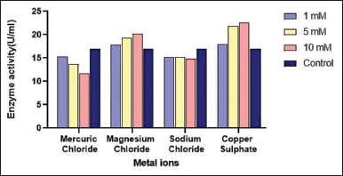 Dialyzed enzyme was subjected to protease activity where the enzyme was pre-incubated in the presence of different metal ions (Na+, Cu+, Hg+, and Mg) at different concentrations (1 mM, 5 mM, and 10 mM).
