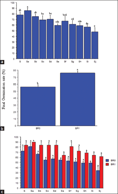 ![]() | Figure 5: Salinity rates (a), brassinolide effect a (b) and SR × BR interactions (c) on germination rate of soybean seeds. SR: Salinity rate; BR=Brassinolide; BR0=No BR application (0 mL): BR1 = 0.5 mL: S = 0.00 dSm-1 (control); Sa = 1.56 dSm-1; Sb = 3.13 dSm-1; Sc = 4.69 dSm-1; Sd = 6.25 dSm-1; Se = 7.81 dSm-1; Sf = 938 dSm-1; Sg = 10.94 dSm-1; Sh = 12.50 dSm-1; Si = l4.06 dSm-1; Sj = 15.63 dSm-1. Mean pairs with different letter are significantly different at the 5% probability level according to Duncan’s’ New Multiple Range test. [Click here to view] |