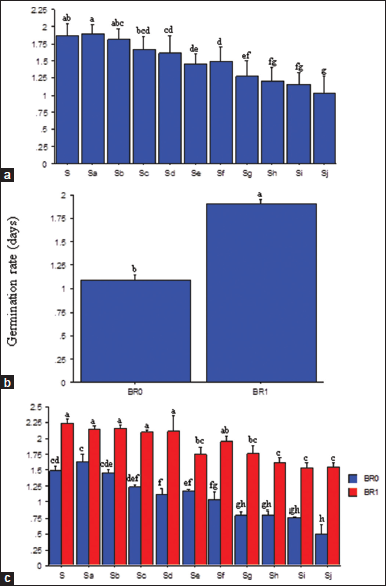 ![]() | Figure 3: Salinity rates (a), brassinolide effects (b) and SR × BR interactions (c) on germination average time of soybean seeds. SR: Salinity rate; BR=Brassinolide; BR0=No BR application (0 mL): BR1 = 0.5 mL: S = 0.00 dSm-1 (control); Sa = 1.56 dSm-1; Sb = 3.13 dSm-1; Sc = 4.69 dSm-1; Sd = 6.25 dSm-1; Se = 7.81 dSm-1; Sf = 9.38 dSm-1; Sg = 10.94 dSm-1; Sh = 12.50 dSm-1; Si = l4.06 dSm-1; Sj = 15.63 dSm-1. Mean pairs with different letter are significantly different at the 5% probability level according to Duncan’s’ New Multiple Range test. [Click here to view] |