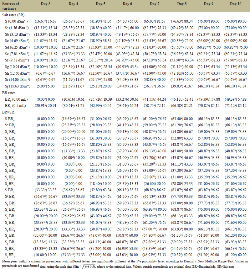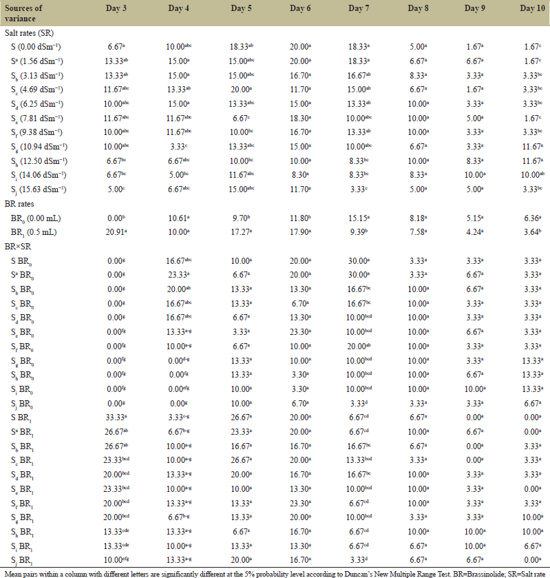 ![]() | Table 1: Main and interaction effects of brassinolide (BR) and sodium chloride (NaCl) concentrations on germination percentage (GP) of soybean seeds on 3–10 days after sowing. [Click here to view] |