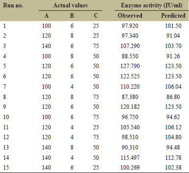Y is the experimental response (enzyme production) and the coefficients indicate the effect of the parameters on asparaginase production. The R2 value is the indicator of variability in the experimental output. In this case, the R-square value was found to be 89.57% for the asparaginase production.