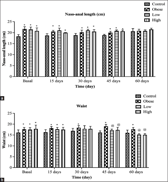 ![]() | Figure 2: Variation of the length of naso-anal with time (a) and waist with time (b). Each bar represents the mean±SE. Statistical analysis was conducted using one-way ANOVA followed by Tukey-Kramer multiple comparisons test for the respective time period. (*vs. control group and @vs. obese group) at P < 0.05. [Click here to view] |