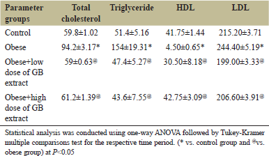 ![]() | Table 3: Lipid profile parameters of obese, obese+ low dose of GB extract, and obese+ high dose of GB extract groups compared to control. Each reading represents the mean±SE. [Click here to view] |