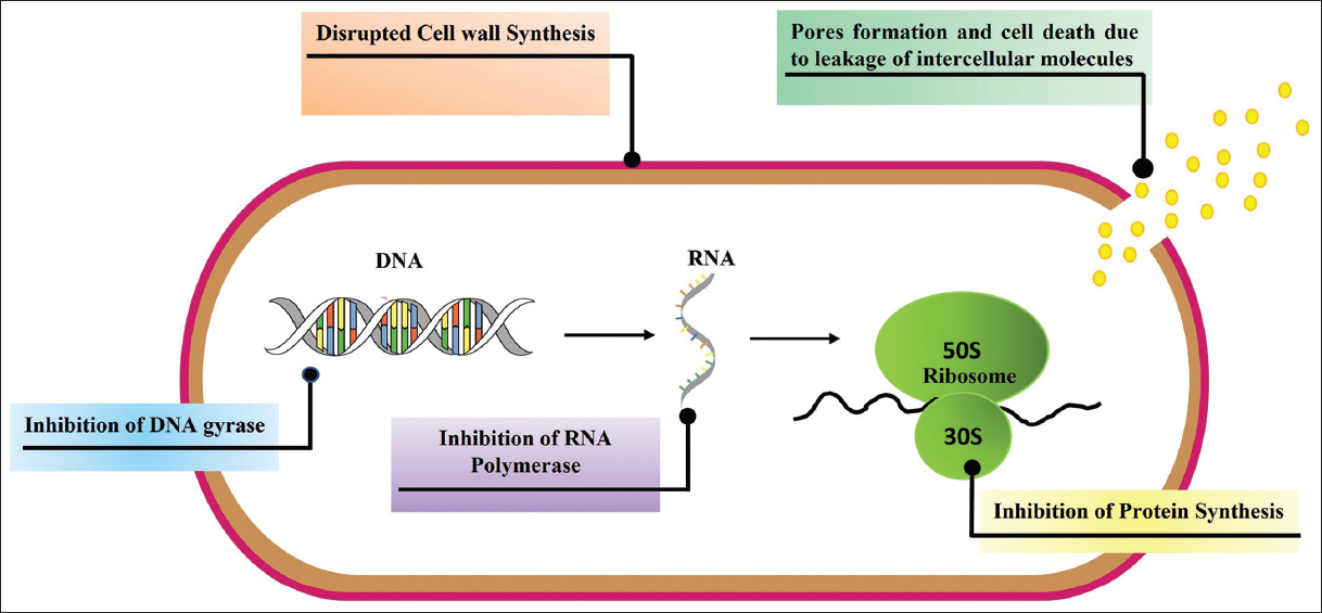 Both antibiotics and bacteriocins have similar mechanisms of action, which include disrupting cell wall formation, inhibiting DNA replication and protein synthesis, and disrupting cell membrane integrity [Figure 1].