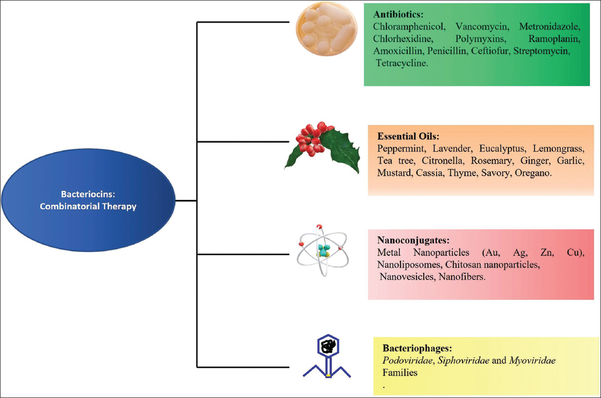 | Figure 2: Bacteriocins combinatorial therapy: Combining bacteriocins with other antimicrobials with distinct modes of action, such as antibiotics, essential oils, nanoparticles, and bacteriophage, can boost antimicrobial efficacy while limiting the risk of resistance. [Click here to view] |