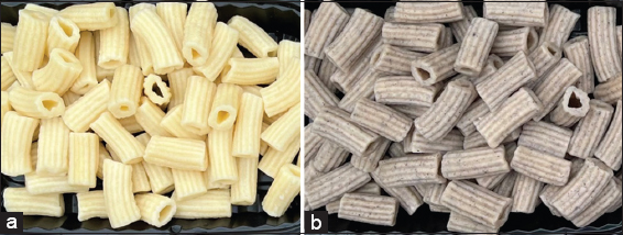 | Figure 1: Macaroni–Control sample M0 (a) and supplemental sample of flour/starch source containing resistant starch M1 (b). [Click here to view] |
