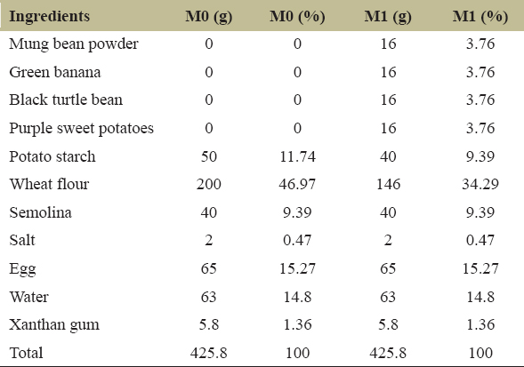 Macaroni products were prepared by mixing all the ingredients into two formulas according to the specified ratio [Table 1]. The control sample M0 in this study was formulated with whole wheat flour and the sample M1 was prepared by replacing a part of wheat flour with high RS flours.
