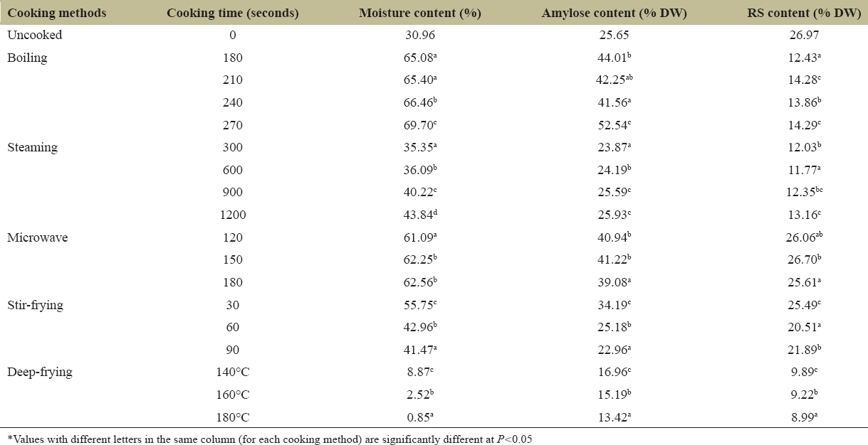 The obtained results shown that cooking conditions have the potential of decreasing and increasing the amount of RS [Table 3].