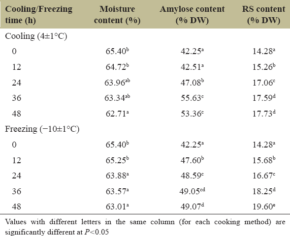 | Cooling/Freezing time (h) | Moisture content (%) | Amylose content (% DW) | RS content (% DW) |