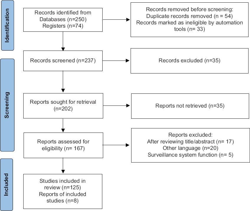 The main collection criteria are based on clinical manifestation with the presence of eschar and laboratory diagnoses such as enzyme-linked immunosorbent assay (ELISA), Weil-Felix (WF) test, IFA test, or nested polymerase chain reaction (PCR) test targeting a 56-kDa gene clinical presentation symptoms and specific complications. Figure 1 illustrates the Preferred Reporting items for Systematic Review and Meta-analysis (PRISMA) flow diagram of identification, screening, eligibility, and inclusion which include in our search criteria. Approximately 324 reports have been collected from different sources and many of them were excluded as those have no clear evidence. In the end, 133 articles met the selection criteria and were approved for the analysis.
