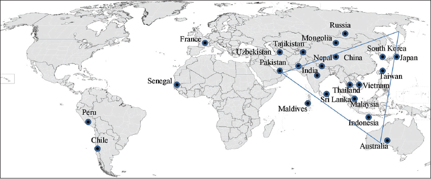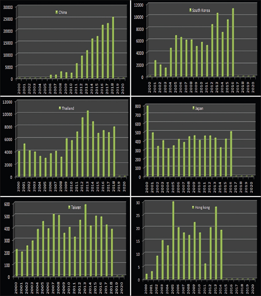 Although this disease has been recognized since 313A.D. and has threatened billions of people in different regions of Asia and Australasia, it is still considered an underdiagnosed and underreported illness [6]. Previously, it was restricted to a specific area ranging from Russia to Japan in the north, Northern Australia in the south to Pakistan, and Afghanistan in the west known as the “tsutsugamushi triangle” ranging a broad area of 13 million km2 [Figure 2] [7]. However, there are confirmed cases of increasing and spreading in other areas such as Dubai, United Arab Emirates [3] Chile, Peru, and Africa. During World War II, confederated forces suffered more destruction due to scrub typhus than the different outcomes of the war in Southeast Asia [8]. The diversity of species and epidemic characteristics in other countries such as China, Japan, South Korea, Taiwan, Hong Kong, and Thailand is represented, as a graph shown in Figure 3 [4-13].