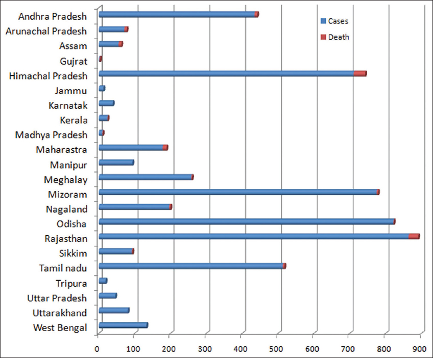 | Figure 5: Graphical representation of state-wise outbreak of scrub typhus. [Click here to view] |