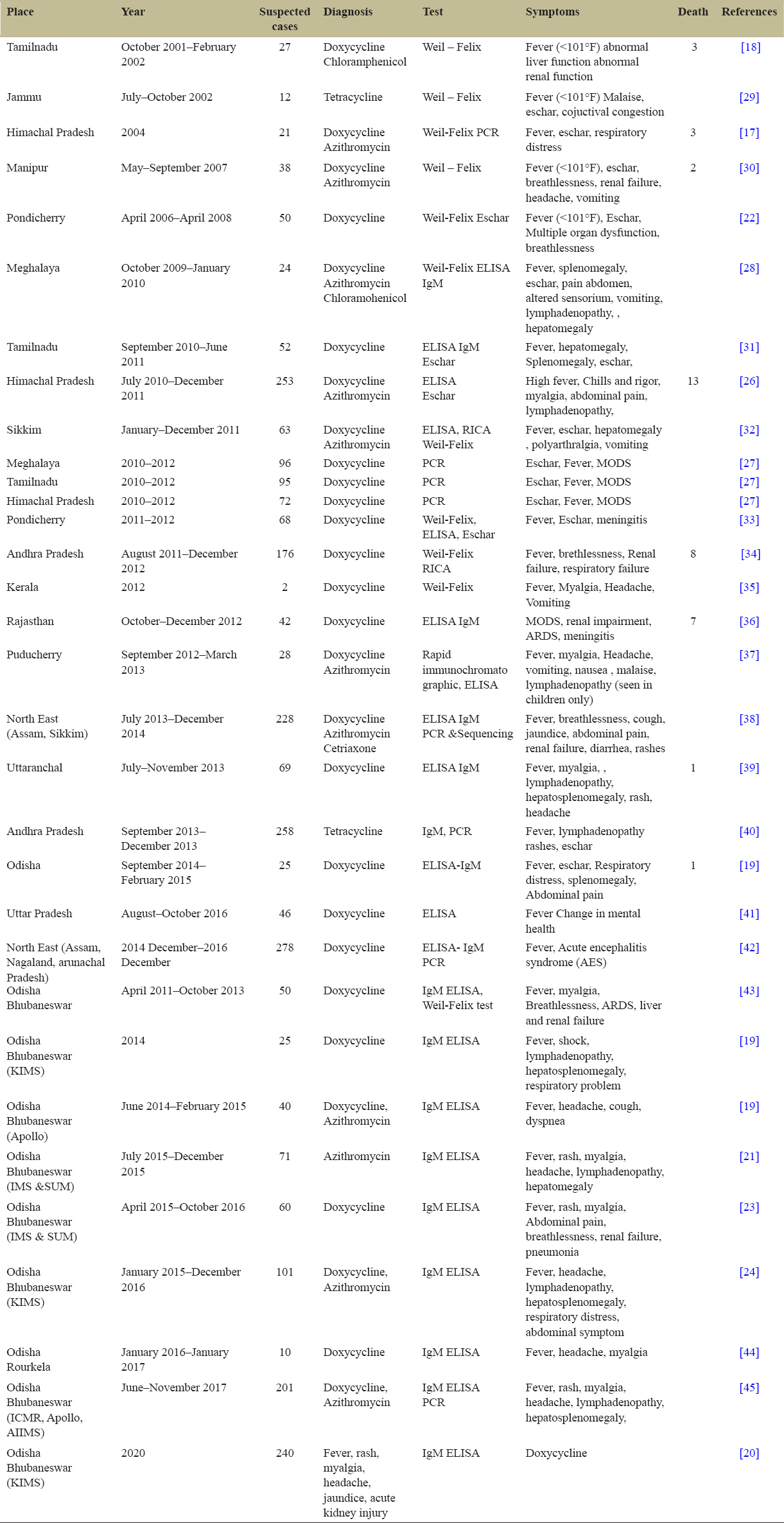 | Odisha | April 2015–October 2016 | 60 | Doxycycline | IgM ELISA | Fever, rash, myalgia, Abdominal pain, breathlessness, renal failure, pneumonia | [23] | |