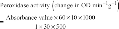 Peroxidase is determined through spectrophotometric determination on measuring the rate of increase of absorbance at 430 nm, according to the protocol adopted by Sadasivam and Manickam [14]. Five hundred milligrams of plant tissues were macerated with 10 ml 0.1M phosphate buffer that was centrifuged at 3000 rpm for 10 min to collect the supernatant. A 3 ml pyrogallol was added to 0.1 ml of supernatant and adjusted to zero reading as blank. A 0.5 ml of H2O2 was added to the same solution and read at 430 nm at an interval of 30 s for a period of 3 min. The peroxidase activity was measured at 45 and 70 DAS in shoots and roots, and it was expressed as per the formula given below: