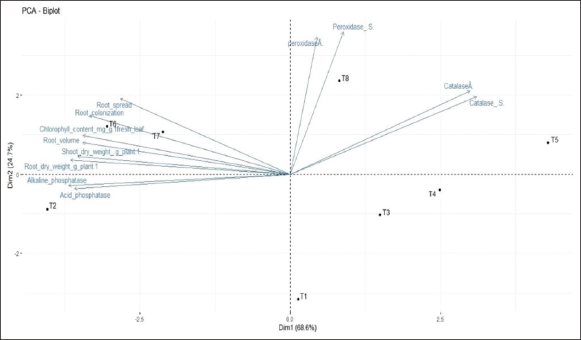 PCA was performed using all attributes among different treatments. Out of the seven PCs, the first three axes with Eigen value of more than 1.0 evidenced that the identified attributes within the axes exhibited a significant influence among the treatments. The PCA biplot [Figure 4] showed T8 and T5 (75 ppm Cd with and without mycorrhizal inoculation) in the positive coordinates for antioxidants in both roots and shoots, whereas other parameters were not influenced significantly. PC1 and PC2 showed variances of 68.6% and 24.7%, respectively. Cd is an important abiotic stress element, which endorses the creation of ROS through the inhibition of electron transport, especially the primary events in Photo system-II [32]. It is a well-known fact that ROS would damage lipids, DNA, RNA, and proteins involved in the constructive metabolism of plant growth. Catalase is an ever-present tetrameric heme-containing enzyme that catalyzes the dismutation of two molecules of H2O2 into H2O and O2, and protects the cell against membrane lipid peroxidation through ROS [33,34].