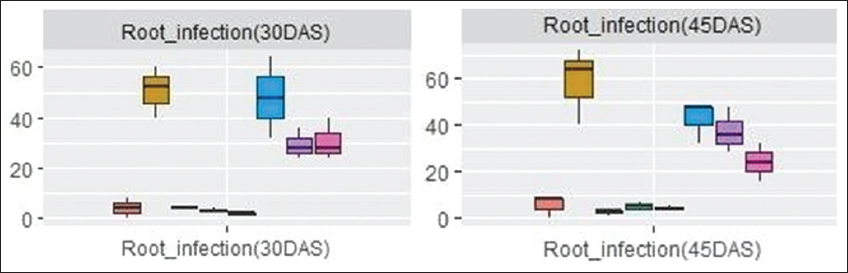 Heavy metal contamination in soil is associated with iron deficiency. Low iron content results in chlorosis, since it inhibits both chloroplast development and chlorophyll biosynthesis [28]. Cd has a direct effect on the structure, composition, and functioning of photo system II domains in the thylakoid membrane of plants [29]. The results of the present study indicate an increase of 19.2–25.7% in the chlorophyll content in AM fungi inoculated plants over uninoculated plants at all Cd spiked levels. This finding was supported by Rivera-Becerril et al. [30] who reported an increase in plant photosynthetic activity by AM inoculation in Cd stress conditions. The increase in chlorophyll content is due to great phosphorous availability and other macro- and micronutrients imported to the plant by the extraordinary multiplication of mycorrhizal spores, high-speed elongation, and profuse branching of extracellular hyphal structures, seen in the in vitro pure inoculum of Gi. The box and whisker plot analysis [Figure 7] shows that mean root infection of Gi at 25 ppm Cd was significantly higher (48%) than at 50 and 75 ppm Cd (28%) during 30 DAS. However, the probability of further increase was not observed on continuous exposure of the same Cd level after 45 DAS. The results suggest that root infectivity varies in accordance with the period of exposure and concentrations of Cd were artificially contaminated in the experimental soil, as stated by Liao et al. [31]. Further, beyond a critical concentration, the plant system might be recalcitrant to heavy metal due to the activation of de nova metabolic pathways and triggering of antioxidant defense system.