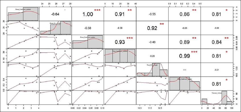 | Figure 8: Correlation plot showing the summarized data of cadmium uptake in shoot and roots. [Click here to view] |