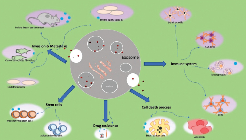 Breast cancer (BC), which has a high mortality rate and the capacity to spread, is the leading cause of death in women globally. Aside from the statistics, the condition is challenging to cure due to its heterogeneity [1]. When it comes to cancer, there are various mysteries, a major part of which is attributable to its tendency to spread. A big part of this is due to the active participation of extracellular vesicles, which affect the microenvironment while simultaneously causing intracellular modifications. Exosomes seem to be an active player in the development of metastatic illness, including cancer, among the extracellular vesicles [2]. This review will examine exosomes, their roles, and methods of generation in the context of cancer therapies and diagnostics, with an emphasis on BC in particular. This is done with participation in every stage of metastatic disease progression, examining it through the prism of Paget’s theory, resulting in issue solutions via detailed study [3]. Exosomes must be studied in depth since they play a crucial part in many of life’s key processes; hence, they must be thoroughly examined.