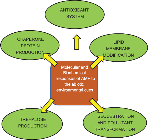 | Figure 3: Summarized details have been provided in the diagram below, which shows list of various Molecular and Biochemical responses shown by AMF inoculated host plants, under various abiotic stresses. [Click here to view] |
