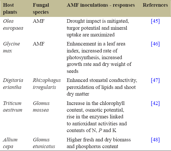 AMF inoculation provides resistance against unfavorable conditions like drought, by increasing the radical hyphae-like structures in the soil and improving the performance of plants even under stressful conditions. Different effects of AMF inoculation with host plants, under drought conditions, ions have been mentioned in [Table 1] [45-48]. Mycorrhizal symbionts deal with water deficit through drought tolerance and drought mitigation mechanisms.