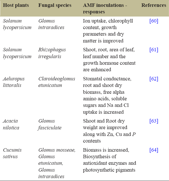Nashar (2017) [54] has reported that leaf water potential, growth rate, and water-use efficiency are enhanced in great snapdragon plants. Under saline conditions, AMF increases stomatal conductance, leaf water relations, and photosynthetic rate [55]. AMF inoculation improves gaseous exchange, photosynthetic rate, chlorophyll contents, and efficient utilization of water in Ocimum basilicum during salinity stress [56]. Wang et al. (2018) [57] reported enhanced dry and fresh weights, N concentration in roots, and shoots during salt stress when inoculated with AMF. Furthermore, plants inoculated with AMF show much synthesis of hormones such as salicylic and jasmonic acid, and other inorganic minerals. Mycorrhizal inoculation with lettuce plant shows an increase in biomass production, increase in the uptake of N, high synthesis of proline, changes in ionic relations specifically decrease in the accumulation of Na+ with contrast to non-mycorrhizal plant, under-stressed environment [51]. In addition, plant growth mediated via AMF promotes the alteration in the pool of polyamine [58]. AMF inoculated lettuce plants showed an increase in strigolactone content mitigating effects of salt stress [59]. Among the mechanisms that contribute to salinity tolerance are ionic homeostasis, accumulation of osmoregulatory such as sugars, and reduction in the Na and Cl uptake. [Table 2] summarizes the tolerance of salt stress in different plant species when inoculated with AMF [60-64].