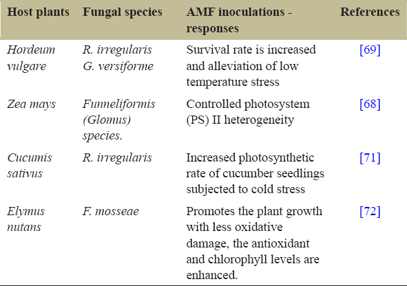 Loss of plant vigor, retardation in the growth rate, senescence, discoloration of fruit, yield reduction, and decreased biomass production are the causes of heat stress, fluctuations in the temperature, or extreme temperature. Temperature stress is among the most important factors, which negatively impact the productivity of the plants [65]. AMF improves the performance of plants to tolerate the vivid temperature by improving photosynthetic efficacy [Table 3], shields plants from severe oxidative stress, and increases the osmolytes content [66]. During salinity stress, shoot and dry root biomass inoculated with mycorrhiza showed higher numbers as compared with non-mycorrhizal association [67]. AMF develops the root system for water absorption in plants at higher temperatures to increase photosynthetic rate and prevention of photosynthetic units from damage [68]. The study of Hajiboland et al. (2019) [69] pointed out that G. versiforme was significantly better at minimizing the cold stress experienced during winter and spring than R. irregularis. The inoculation of the Barley (Hordeum vulgare) with AMF increased the number of parameters such as osmotic homeostasis, plant growth, photosynthesis, and potassium uptake [69].