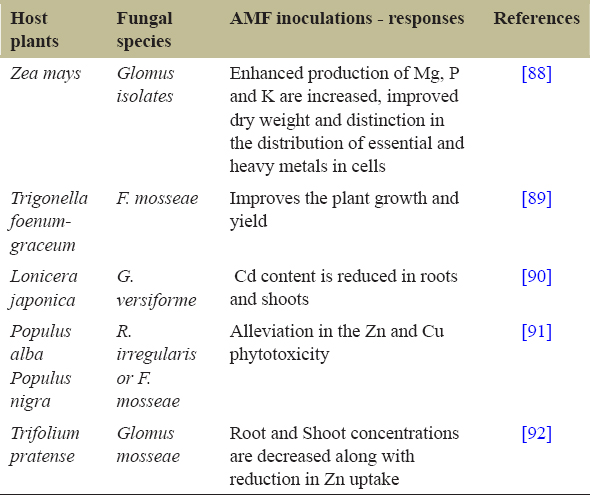 In soil contaminated with heavy metals, AMF can establish a plant community because it enhances the defense system of inoculated plants, thereby promoting plant growth and development. Heavy metals are found in soils that are contaminated by mining or polluted sites, which contain AMF that are adapted to soil pollution. A number of studies have shown that around 80% of plants growing on or near mining sites are infested with AMF. Heavy metals can accumulate in various fruits, crop plants, vegetables, and soil posing a threat and causing a wide range of health problems [73,74]. In the soil where cadmium and zinc are quite abundant, suppresses root and shoot growth, results in leaf chlorosis, and even kills plants [75]. A fungal hypha of external and internal origin [76] can immobilize the heavy metals in the cell wall, storing some of them in vacuoles, or chelating them with substances in the cytoplasm [77] and reducing their toxicity significantly in plants. Chelation or enhanced growth in the soil of rhizospheric origin can cause the dilution of metals in plant cells and tissues [58,78]. AMF also binds to the Zn and Cd, in the cell walls of cortical cells and mantle hyphae, thereby, refraining from the excessive uptake of these minerals and improving the entire nutrient status of plants [79,80]. Uptake of several heavy metals by plants and subsequent movement from roots to the aerial parts are highly disturbed by mycorrhiza symbiosis [81,82]. Mycelia of many strains of AMF have a high cation exchange capacity and can absorb heavy metals [83]. AMF regulates the uptake of important inorganic minerals [Table 4], such as higher uptake of silicon has been reported in Zea Mays [84] and Glycine max [85]. Hammer et al. (2011) [86] has recorded that hyphae and spores of Rhizophagus irregularis have seen a considerable uptake in Si amounts. AMF inoculation increased cadmium tolerance in alfalfa species [87]. Bioremediation by AMF occurs by the dense hyphal network which binds heavy metals. Heavy metal toxicity is solely affected by the type of mycorrhizal association and the type of plant. Inoculation with AMF has been shown to enhance germination of seeds, plant growth, fresh, and dry weight [88-92].
