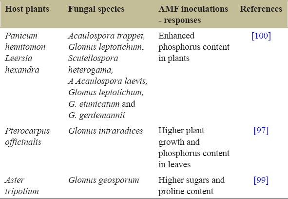 | Panicum hemitomon Leersia hexandra | Acaulospora trappei, Glomus leptotichum, Scutellospora heterogama, A Acaulospora laevis, Glomus leptotichum, G. etunicatum and G. gerdemannii | Enhanced phosphorus content in plants | [100] |