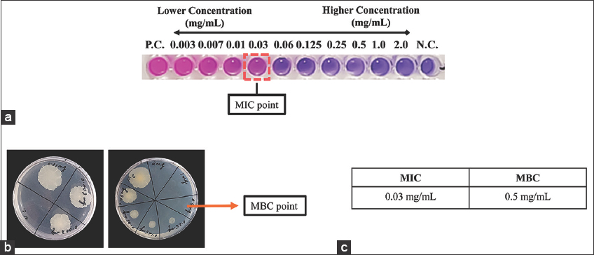| Figure 1: In vitro growth effect of Mycobacterium smegmatis using garlic essential oil (a) minimum inhibitory concentration (MIC) in liquid phase, (b) minimum bactericidal concentration (MBC) in 7H11 agar medium, and (c) MIC and MBC representative values of garlic essential oil. [Click here to view] |