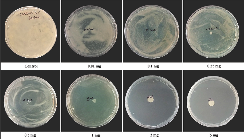 Considering the positive results obtained from antimicrobial activity of garlic essential oil, it was interesting to correlate these results in gaseous contact against M. smegmatis using an inverted disc volatilization assay. As disc volatilization technique is one of the fundamental experiment for evaluating the antimicrobial properties of essential oil in vapor-phase, as well as also used as a preliminary screening method to select the most promising oil [24]. Considering the above remark, our results reflect that there was dose dependent inhibitory activity of volatile GEO. The minimum inhibitory dose (MID) of essential oil in vapor concentration is 1 mg (1 μL), which was able to restrict the growth of M. smegmatis. However, below 1 mg (1 μL) of GEO showed growth of bacteria in plate but in a dose dependent manner [Figure 2].