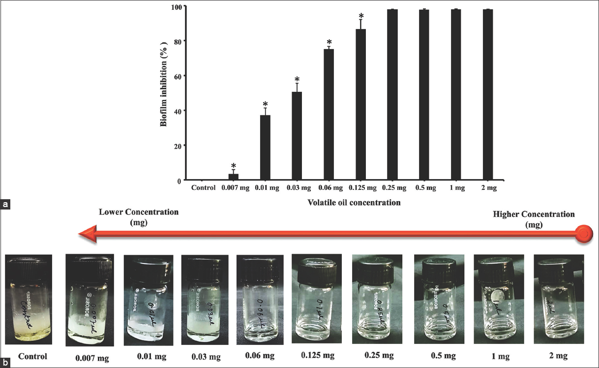 | Figure 3: Effect of air-liquid interface in eradication of NTB (Mycobacterium smegmatis) biofilm using volatilization assay. (a) Percentage of biofilm inhibition at different volatile concentration of garlic essential oil (GEO); data are presented as means (n = 3), error bars represent SD. *Indicates statically significant at P < 0.05. (b) Phenotypic observations of anti-biofilm activity using fume GEO. [Click here to view] |