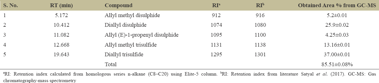 Chemical analysis of volatile essential oil from garlic bulbs was performed using Clarus 580 GC coupled with SQ8S MS detector equipped with Elite-5 capillary column (30 m length × 0.25 mm I.D., film thickness 0.25 μm). Helium was used as a carrier gas and kept at a constant flow rate of 1 mL/min. The GC-MS was used under the following conditions: The oven temperature was first set at 60°C and subsequently increased to 220°C at a rate of 3°C/min; the electron ionization voltage was set at 70 eV, and the ion source temperature was set at 250°C. Following that, a series of carbon-n-alkanes (C8-C20) chains was used for calculating individual peak areas and side by side experimental retention index values reported in Satyal et al. (2017) literature and the NIST library were assessed for identification of volatile components from GC-MS analysis [22,23].