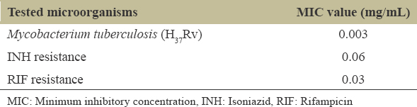 The non-tubercular bacterium used in this study, M. smegmatis mχ2 155 (ATCC14468), was initially procured from MTCC Chandigarh. M. tuberculosis H37Rv, one clinical isolates of isoniazid resistant and one rifampicin resistant isolate, was obtained from ICMR-Regional Medical Research Centre (RMRC), Bhubaneswar. All cultures were maintained in Middlebrook 7H9 broth medium with supplements to 10% oleic acid/bovine albumin, dextrose, catalase (OADC), 0.05% Tween 80, and 0.2% glycerol at 37°C for 48 h shaking incubation period for M. smegmatis and 15 days for M. tuberculosis. The bacteria cells containing 1 × 105 CFU/μL were maintained throughout this study for assessment of antimicrobial activities in liquid phase assay. Furthermore, other chemical reagents used in this study were obtained from HiMedia Pvt. Ltd. (Mumbai, India) and used as respective evaluation in vitro volatilization effects.