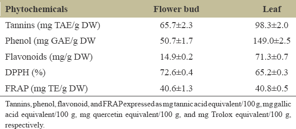Secondary metabolites such as phenolics, flavonoids, and tannins are the principal constituents of medicinal plants responsible for pharmacological activity [28]. The ethnomedicinal study has reported several therapeutic and pharmacological values for C. obliqua [1]. The above phytochemicals were found to be in higher quantity in leaf samples than in flower buds [Table 3]. Flavonoids are a group of polyphenolic compounds responsible for free radical scavenging inhibition of hydrolytic and oxidative enzymes, as well as anti-inflammatory action [26]. These are vital in combating the free radicals which damage human cells. Numerous epidemiological studies confirm a significant relationship between the high dietary intake of flavonoids and the reduction of cardiovascular and carcinogenic risk. These phenolic compounds possess a wide spectrum of biochemical activities, such as antioxidant, antimutagenic, and anticarcinogenic, as well as the ability to modify gene expression [24].