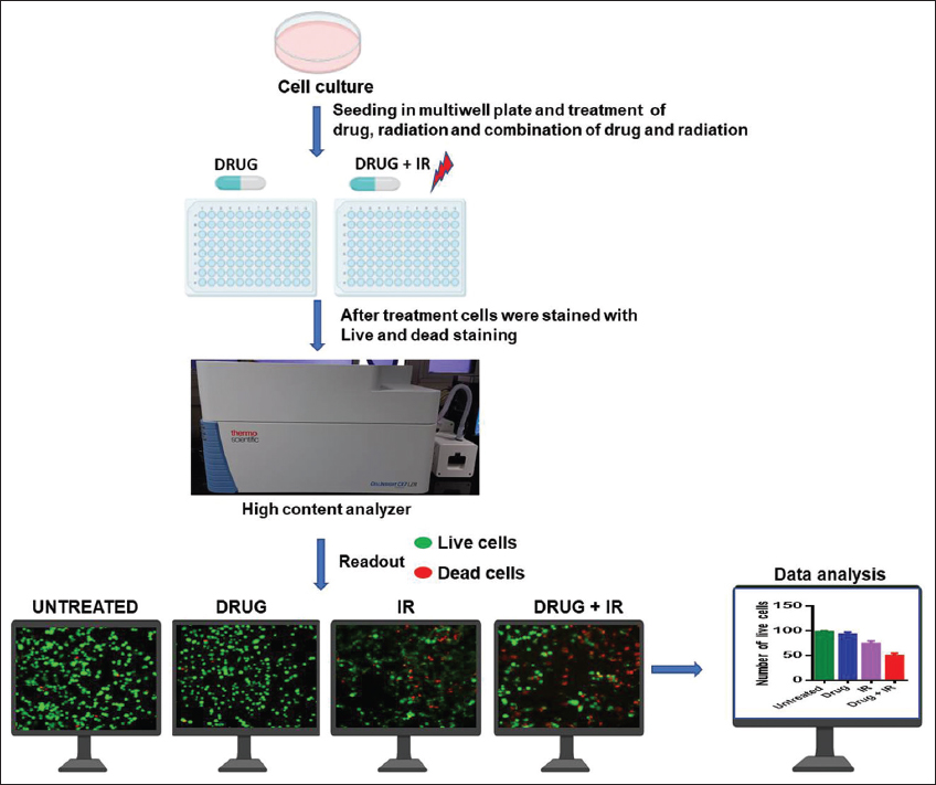 | Figure 2: High-throughput screening of radiosensitizer using live/dead staining. The cultured cells are transferred to a multiwell plate. Then the cells are treated with drug alone, radiation alone, and both drug and radiation. One condition remains as the untreated condition. After a certain time point, the cells are stained with live/dead staining and analyzed using a high content analyser. [Click here to view] |